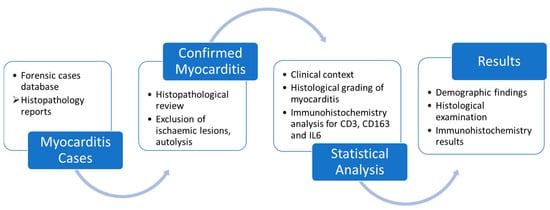 We interrogated the database of the Department of Histopathology for the word “myocarditis”. This was the sole inclusion criterion. However, we excluded cases with autolytic changes in order to avoid false reactions during immunohistochemistry testing (Scheme 1).