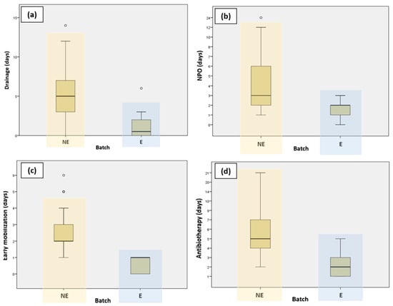Graphic representation comparing ERAS and non-ERAS groups in terms of (a) duration of drainage; (b) NPO (nil per os); (c) early mobilization; and (d) antibiotherapy.
