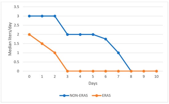 Patients in the ERAS group received significantly fewer fluids postoperatively compared to those in the non-ERAS group, as shown in Figure 2.