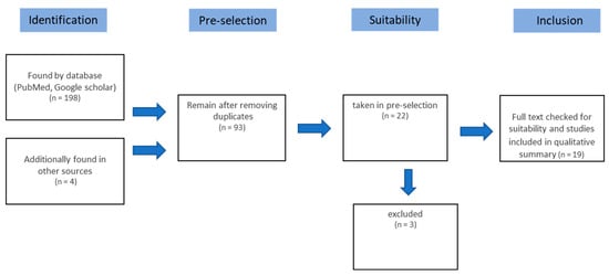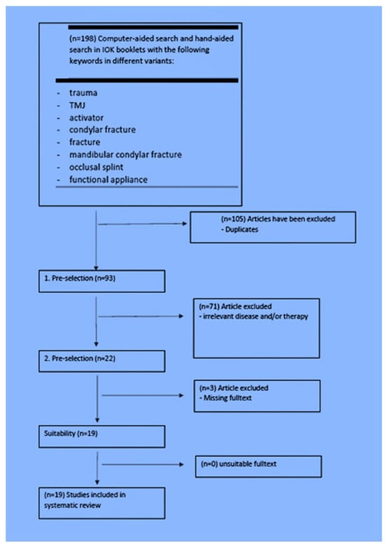 For the structured literature analysis, an electronic search was conducted in PubMed, and Google Scholar, as well as a manual search (IOK issues) using the keywords “trauma”, “TMJ”, “activator”, “condylar fracture”, “fracture”, “mandibular condylar fracture”, “occlusal splint” and “functional appliance”. The inclusion criteria for the articles included in the study were that patients with a mandibular condyle fractures were treated with functional orthodontics and the success of the treatment was reported. Furthermore, the key words mentioned had to have been mentioned in the literature. In general, only articles from 1971 up to 2018 were included in this study. A total of 198 studies on functional orthodontic treatment of mandibular condyle fractures were found. Exclusion criteria after reviewing the 198 articles included duplicates, studies with non-applicable diseases and therapies, a missing full text, and non-English literature. Screening and analysis of study admissibility were performed, considering PRISMA (Preferred Reporting Items for Systematic Reviews and Meta-Analyses) for systemic reviews (Figure 1 and Figure 2).