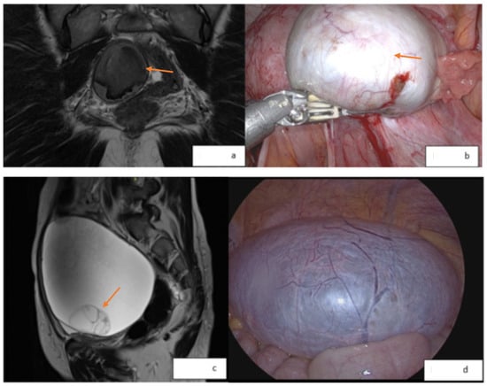 There is also an additional ability to evaluate for atypical features within an endometrioma. The MRI features of endometriosis-associated ovarian cancer (EAOC) include intermediate T2 signal (particularly the loss of T2 shading due to the dilution of hemosiderin within an endometrioma by increased fluid produced by a tumor), solid enhancing mural nodules within an otherwise cystic lesion, irregular and nodular septations, and restricted diffusion on diffusion-weighted imaging (DWI) [,]. It is important to remember that these findings are non-specific and may not always be associated with malignancy []. Examples of MR images and associated laparoscopic findings from normal and malignant endometriomas are shown in Figure 1.