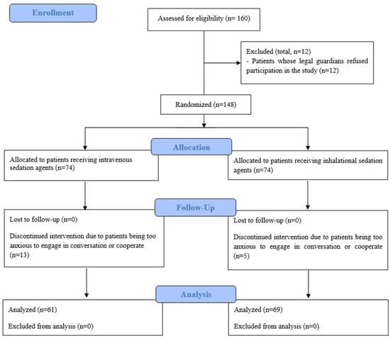 Initially, 160 patients were assessed to be eligible for participation. Prior to randomization, 12 were excluded due to their legal guardians’ refusal to participate. Consequently, 148 patients were enrolled and randomized into two groups (IHG: n = 74, IVG: n = 74). During follow-up, due to anxiety-related non-cooperation, the IHG experienced 5 dropouts and the IVG had 13. Ultimately, 61 patients in the IVG and 69 in the IHG were analyzed (Figure 1).