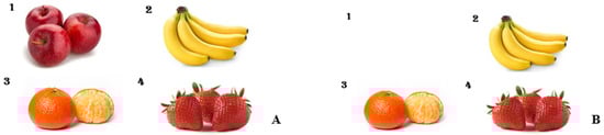 Prior to the procedure, in the preoperating preparation room, a pre-sedation picture card (Figure 2A) displaying four different fruit images, each with a varying number of fruits, was shown to the patients by medical staff. Each child was asked to name the fruits and count the quantities. They were registered as subjects in this study only after successfully recalling and correctly identifying all images and their corresponding numbers. Following the pre-sedation picture test, patients were transferred to the procedural room. Each patient received 1 mg/kg ketamine for induction and then was maintained on light sedation with mask ventilation. The IHG received 2.5 vol% sevoflurane, while the IVG was administered continuous propofol at a rate of 100 mcg/kg/min. Pain management included administering fentanyl at 1.5 μg/kg for BMA and 1 μg/kg for ITC at the start of the procedures. In cases of movement, the IHG dosage was adjusted to 3.5 vol% sevoflurane with an additional 0.5 μg/kg fentanyl, and for the IVG, propofol was increased to 0.5 mg/kg with 0.5 μg/kg fentanyl. After the procedures, patients were moved to the recovery room and maintained on an oxygen mask until fully awake. In the recovery room, sedation scores (Table 1) and behavioral response scores (Table 2) were evaluated. Upon awakening, a post-sedation test picture (Figure 2B) showing a single omitted fruit was presented to see if patients could recall the missing fruit and its count. A successful recall was marked as a ‘Pass.’ Herein, this pre- vs. post-sedation test is called the early recognition assessment (ERA) tool.