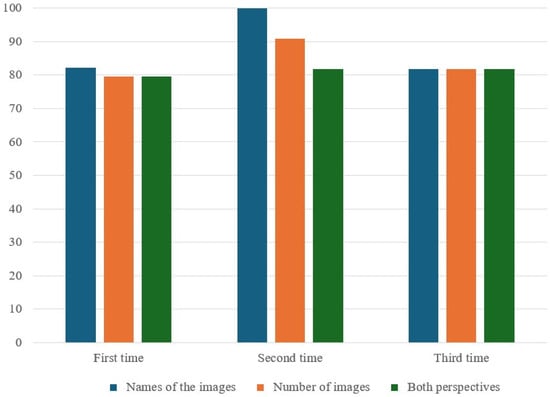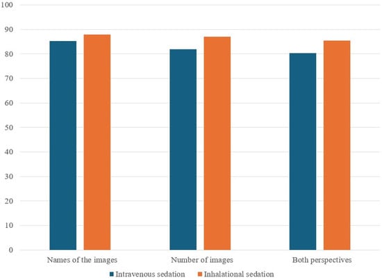 The impact of the number of sedation procedures on correct response rates is detailed in Table 5 and Table 6. For the IVG (Table 5 and Figure 4), correct response rates for naming images initially increased from 82.1% in the first procedure to 100.0% in the second procedure, then slightly decreased to 81.8% in the third. This trend was not statistically significant (p = 0.313). Similarly, the rates for the number of images and both perspectives showed no significant changes across the different procedural exposures (p = 0.685 and p = 0.976, respectively).