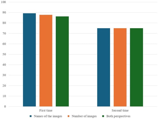 In the IHG (Table 6 and Figure 5), the rates for naming images were higher for first-time procedures (89.2%) than for second-time procedures (75.0%), although this difference was not statistically significant (p = 0.396). The same trend was observed for counting the number of images (87.7% first time vs. 75.0% second time, p = 0.436) and for both aspects combined (86.2% first time vs. 75.0% second time, p = 0.474).