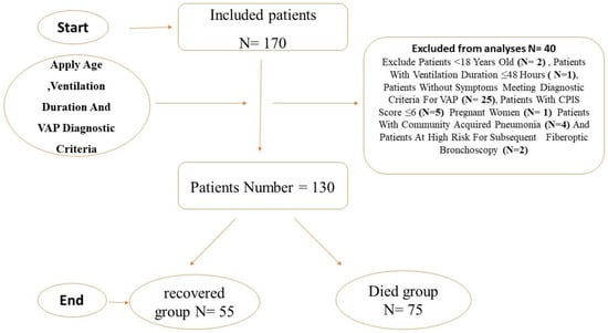 A total of 130 patients diagnosed with VAP between November 2022 and June 2023 were included in the study. These patients were admitted to the Emergency, Surgical, and Respiratory Intensive Care Units in Zagazig University Hospitals. All patients diagnosed with VAP during the study period were enrolled and followed for outcomes. Survival was censored at the time of hospital discharge. The participants were subsequently categorized into two groups based on their outcomes: the “died” group, consisting of 75 patients who did not survive until hospital discharge, and the “recovered” group, consisting of 55 patients who survived until hospital discharge.