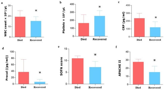 Bar charts showing the comparative scores between the “died” and “recovered” groups of VAP Patients. (a) WBC count, (b) platelet count, (c) CRP, (d) procalcitonin, (e) SOFA, and (f) APACHE II Scores. * p-value < 0.001.