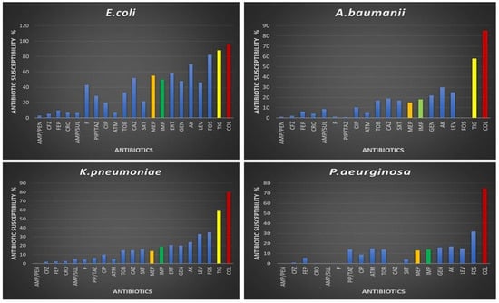 Antibiotic susceptibility profiles of E. coli, A. baumanii, K. pneumoniae, and P. aeruginosa. Abbreviations: AMP/PEN (ampicillin/penicillin), CFZ (cefazolin), FEP (cefepime), CRO (ceftriaxone), AMP/SUL (ampicillin/sulbactam), F (nitrofurantoin), PIP/TAZ (piperacillin/tazobactam), CIP (ciprofloxacin), ATM (aztreonam), TOB (tobramycin), CAZ (ceftazidime), SXT (sulfa-trimethoprim), MEP (meropenem), IMP (imipenem), ERT (ertapenem), GEN (gentamycin), AK (amikacin), LEV (levofloxacin), FOS (Fosfomycin), TIG (tigecycline), COL (colistin).