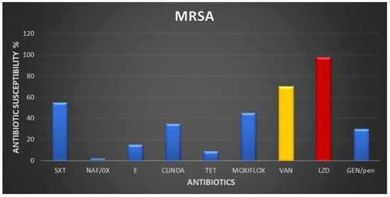 Antibiotic susceptibility of Gram-positive MRSA. Abbreviations: NAF/OX (nafcillin/oxacillin), E (erythromycin), CLINDA (clindamycin), SXT (sulfa trimethoprim), TET (tetracycline), GEN/pen (gentamycin/penicillin), MOXIFLOX (moxifloxacin), VAN (vancomycin), LZD (linezolid).
