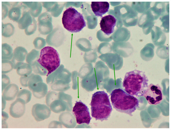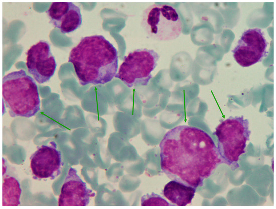 Bone marrow aspirate at the moment of diagnosis. May–Gruenwald–Giemsa, ×1000. Several atypical cells (green arrows) with blast-like morphology.