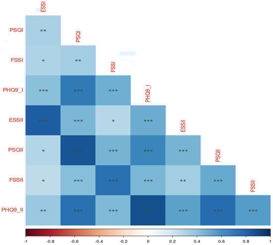 Correlation between self-evaluation scales. * p < 0.05; ** p < 0.01; *** p < 0.001.