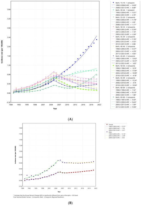(A) Age group-stratified joinpoint regression analysis of incidence rates between 1990 and 2021 in Türkiye; APC: annual percentage change; (*) indicates p < 0.05. (B) Gender-stratified joinpoint regression analysis of incidence rates between 1990 and 2021 in Türkiye; APC: annual percentage change; (*) indicates p < 0.05.