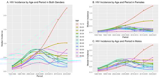Figure 3 illustrates the median HIV incidence by age group and period, disaggregated into three categories: both genders combined, females only, and males only. Each line represents a different age group, indicated by distinct colors, spanning from ages 15 to over 65. The x-axis represents consecutive time periods from 1990 to 2021, divided into five-year intervals (except for the last period, which consists of 2 years).