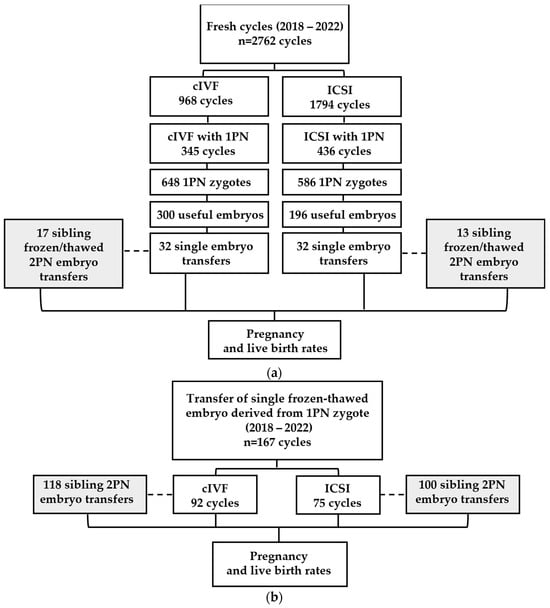 - Si, J.; Zhu, X.; Lyu, Q.; Kuang, Y. Obstetrical and neonatal outcomes after transfer of cleavage-stage and blastocyst-stage embryos derived from monopronuclear zygotes: A retrospective cohort study. Fertil. Steril. 2019, 112, 527–533. [Google Scholar] [CrossRef]