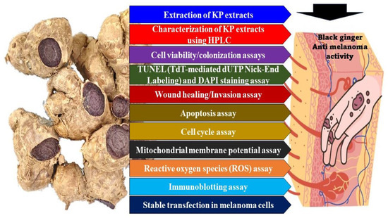 In this study, we investigated the effects of black ginger extracts on human melanoma cell lines A375 and A2058. While the impact of KP on various cancer cell lines has been documented, its effect on melanoma cell lines has not been previously explored. This study is the first to report that KP extracts induce apoptosis in melanoma cells via mitochondrial damage. The MUDENG perspective behind the KPE anticancer activity has also been highlighted for the first time. Various aspects of the interaction between KP extracts and melanoma cell lines were analyzed and reported. The findings provide compelling evidence that black ginger extracts hold potential as a novel antimelanoma therapy, triggering positive feedback for their therapeutic use.