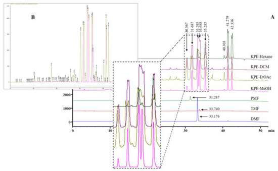 (A) HPLC results of KPE bioactive compounds; Inset (B) showing PMF peaks in KPE-EtOAc.