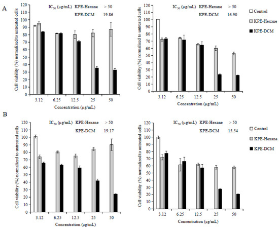 Melanoma cells were plated at a density of 1 × 104 cells per well in a 96-well microplate and incubated overnight at 37 °C with 5% CO2. The following day, cells were exposed to varying concentrations of solvent extracts (3.12, 6.26, 12.5, 25, and 50 µg/mL) or KPE-DMSO control (maximum concentration of 0.05%) in triplicate. Morphological changes post-treatment were observed using a Zeiss Axiovert 200 M inverted microscope (Carl Zeiss, Oberkochen, Germany). Cell viability was assessed using the WST-1 assay. Absorbance was measured at 450 nm with a reference wavelength of 600 nm using a microplate reader, and the data were analyzed with Gen5 software (version 3.12, BioTek, Winooski, VT, USA) [13]. Cell viability was calculated based on absorbance readings at 450 nm, with 600 nm as the reference wavelength;