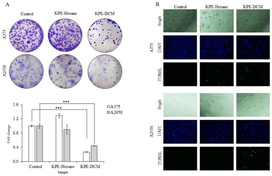 A colony formation assay was performed to examine the ability of a single cell to grow into a colony, and TUNEL staining was conducted to assess the apoptotic and DNA-damaged cells. The results showed that KPE-DCM-treated cells brought about significant inhibition of colony formation compared to the control and KPE-hexane-treated cells (Figure 4A). DNA fragmented cells were also observed following TUNEL staining. As observed from the results, KPE-DCMtreated cells resulted in TUNEL-positive cells (green) in both melanoma cells, but KPE-hexane-treated cells showed a positive effect on A375 cells only and had no impact on control cells. This result suggests that KPE–DCM affects colony formation and DNA-fragmented apoptotic cells, but, in the case of KPE-hexane, it affected DNA-fragmented cells in A375 but had no inhibitory effect on colony formation.