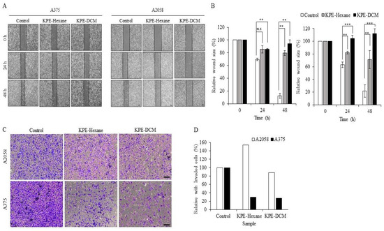 Cell migration and invasion were measured to evaluate whether extracts prevent the metastatic proclivity of melanoma cells. KPE-DCM was found to decrease migration but, KPE-hexane and the DMSO control did not prevent migration in both melanoma cells (Figure 5A,B). In addition, cell invasion significantly decreased after 48 h treatment with KPE-DCM and KPE-hexane with respect to A375 cells. However, this was not the case with A2058 cells (Figure 5C,D). These results suggest that KPE-DCM inhibits melanoma cell migration and invasion.