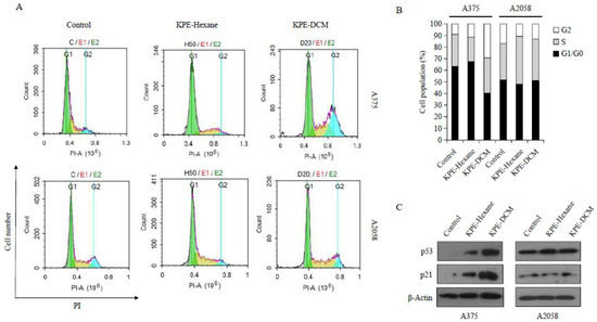 Cell cycle arrest is one of the most important mechanisms by which anticancer agents exert their inhibitory effects. Therefore, the impact of KPE on cell cycle phase dissemination with respect to melanoma cells via flow cytometry (Figure 6A) was assessed. Our results interestingly confirmed that when the two melanoma cells were treated with KPE-DCM and KPE-hexane for 24 h. As shown in Figure 6B, the cell population of the G2 phase was approximately 8.9%, 11.2%, and 28.7%, respectively, after treatment with control, KPE-hexane and KPE-DCM for 24 h in the case of A375 cells. On the other hand, A2058 cells do not influence cell cycle arrest following treatment with KPE-hexane and KPE-DCM. This result suggests that the cell cycle transition from G0/G1 into the G2 phase was promoted by KPE-DCM in A375 cells but had no effect when it came to A2058 cells.