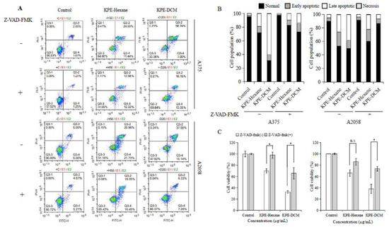 To investigate the apoptotic pathway induced by KPE, we performed an Annexin V/PI staining assay in Z-VAD-FMK (pancaspase inhibitor; 20 µM)-pretreated and KPE-DCM and KPE-hexane-treated A375 and A2058 cells. As shown in Figure 7, hexane- and DCM-treated cells increased apoptotic cell population compared to the control without Z-VAD-FMK in both melanoma cells. Conversely, Z-VAD-FMK pretreatment substantially suppressed this effect in both melanoma cells. Additionally, cell viability significantly recovered with Z-VAD-FMK pretreatment. Cell survival recovered following treatment with a pancaspase inhibitor. Based on these results, it is suggested that KPE-hexane and KPE-DCM effectively induced apoptosis pathways in both melanoma cells.