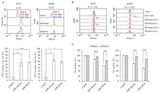 Melanoma cells (2.5 × 105 cells/well) were seeded into a 6-well plate and incubated overnight. The following day, the cells were pretreated with N-acetyl cysteine (NAC) for 1 h, followed by treatment with KPE-hexane and KPE-DCM for 24 h. After the treatment, the cells were harvested and stained with 2′,7′-Dichlorodihydrofluorescein diacetate (Enzo Life Sciences, Farmingdale, NY, USA). Fluorescence measurements were performed using the NovoCyte 1000 flow cytometer, and the results were visualized using NovoExpress software (ACEA Biosciences).