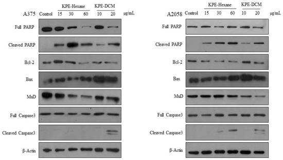 We performed western blotting to examine the effect of KPE-hexane and KPE-DCM on the activation of pro-apoptotic protein (cleavage-PARP, cleavage-caspase-3 and Bax) and anti-apoptotic (MuD and Bcl-2) protein inactivation. As shown in Figure 9, KPE-hexane and KPE-DCM treatment upregulated cleavage-PARP, cleavage-caspase-3, and Bax. As expected, they downregulated the expression levels of anti-apoptotic proteins, which are MuD and Bcl-2 in A375 and A2058. These results are suggestive of the effect of KPE-hexane and KPE-DCM on the upregulation of the apoptotic cell death signaling pathway.