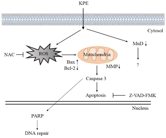 The mitochondria-mediated apoptosis is regulated by a delicate balance between the opposing actions of pro-apoptotic and anti-apoptotic Bcl-2 family members. The mitochondrial/caspase-mediated signaling cascade is a major apoptotic pathway that is characterized by MMP, whose disruption leads to the release of cytochrome c into cytoplasm, triggering the caspase cascade and PARP cleavage [14,35]. In this study, KPE treatment resulted in the upregulation of cleavage PARP and caspase-3 and downregulation of Bcl-2 and anti-apoptotic protein MuD expression in both cells (Figure 10). It was previously reported that TMF effectively inhibited the proliferation of SNU-16 human gastric cancer cells in a concentration-dependent manner by inducing apoptosis through various pathways, including ER stress, as evidenced by multiple cellular markers among the DMF, TMF, and PMF isolated from brewed tea samples [12].