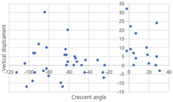 The crescent angle ranged from −112 degrees to 31 degrees, and vertical displacement ranged from −12 mm to 32 mm (Figure 5). The distribution chart shows the relationship between crescent angle and vertical displacement.