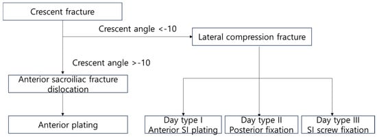 Patients diagnosed with ASFDs underwent treatment using anterior pelvic plating, which was approached through a lateral window. Those with LC 2 fractures received treatment with either sacroiliac screws or anterior pelvic plating, depending on the fracture morphology. Previously, Day classification was used to determine the approach and fixation construct to treat patients with crescent fractures. But Day classification is not useful for patients with ASFDs, since patients with ASFDs require an anterior approach to reduce vertical displacement and need anterior plating to maintain the reduction. The patients with ASFDs and Day type III also required anterior plating, not sacroiliac screw fixation. Among our patients, 20 percent of ASFDs were classified as Day 2 or 3. Therefore, patients with crescent fractures should first be classified according to the crescent angle and, if not an ASFD, by Day classification (Figure 6). In this way, we could manage to reduce the vertical displacement of ASFD effectively, and all patients achieved bone union without vertical displacement.