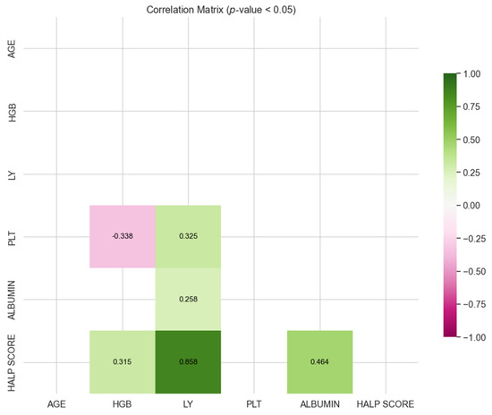 Figure 2 shows that there was a weak positive correlation between albumin and lymphocyte, and a moderate negative correlation between platelet and hemoglobin. Similarly, there was a moderate positive correlation between platelet and lymphocyte, between HALP score and hemoglobin, and between HALP score and albumin. Additionally, there was a very strong positive correlation between HALP score and lymphocyte.