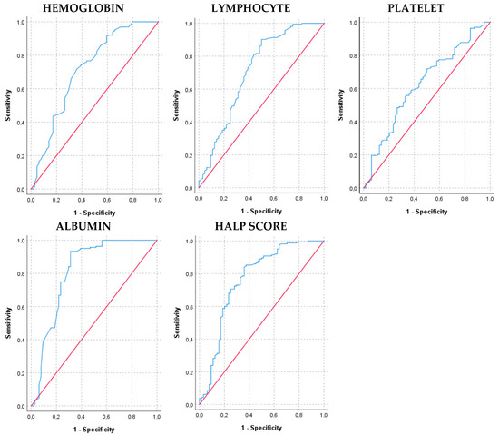 Hemoglobin, lymphocyte, platelet, albumin, and HALP score for survivor and exitus groups are depicted in the ROC curve. The diagonal red line denotes the ROC curve of a random classifier.