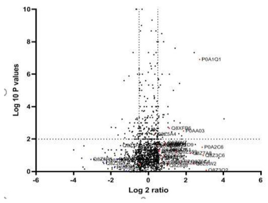 After MDR and XDR S. Typhi confirmation, the protein lysate was resolved on SDS PAGE and stained. Each gel band was sliced and processed for LC-LTQ-Orbitrap MS analysis (Figure 1). A total of 1267 proteins were identified. The differential proteome data are plotted on a volcano plot. Two-fold (horizontal) and p < 0.05 cut-offs are indicated by dotted vertical lines (Figure 2).