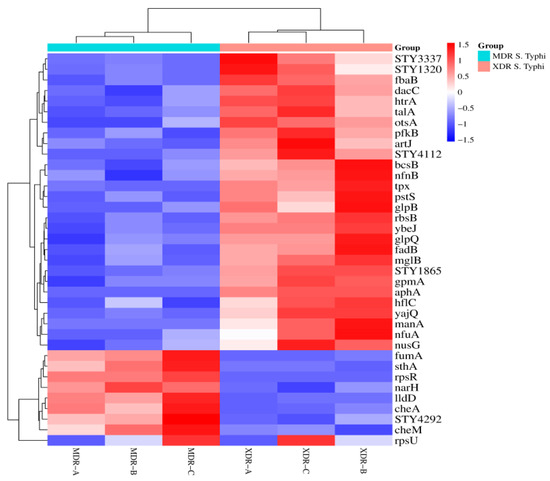 The heat map cluster matrix between XDR and MDR S. Typhi was created to present the protein expression changes (fold change). The column represents the sample type, while the rows represent proteins (Figure 3).