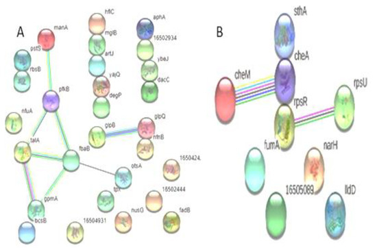 Predicted interaction of up-regulated proteins (A) (n = 28) and down-regulated proteins (B) (n = 9) of S. Typhi: (A) Showing direct interaction of hflC, mglB, artJ, yajQ, degP, gloQ, nfnB, pstS, rbsB, aphA, 16502934, ybeJ, and dacC and indirect interaction of manA, pfkB, talA, fbaB, gpmA, otsA, glpB, and gloQ. (B) Showed the non-interaction of IIdD, narH, 16505089, fumA, and cheA and the direct interaction of rpsR, cheA, and sthA, and the indirect interaction of cheM with cheA; rpsR interacts with rpsU.