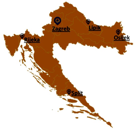 Geographical locations of clinical centres in Croatia which were included in this study.