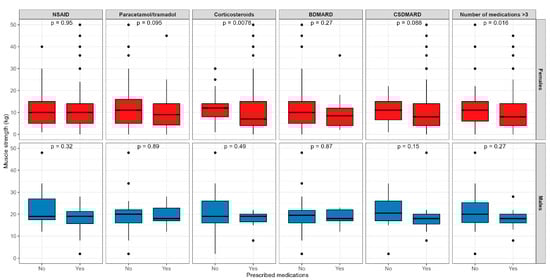 Differences in muscle strength regarding the different medication prescriptions in Croatian rheumatoid arthritis participants. Abbreviations: NSAID—non-steroid anti-inflammatory drug, BDMARD—biological disease-modifying anti-rheumatic drug, CSDMARD—conventional synthetic disease-modifying anti-rheumatic drug.