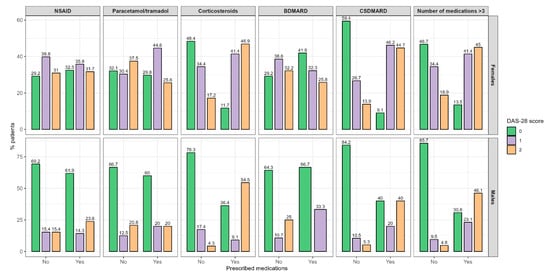 A significant difference was found for the CS and CSDMARD therapies in males and females. The CS were more frequently prescribed in higher stages of disease activity in both males and females (p = 0.003 and p < 0.001, respectively). On the other hand, CSDMARDs in females were prescribed in higher disease activity stages (p < 0.001); meanwhile, in the male participants, they were equally prescribed in the lowest and highest disease activity groups (p = 0.018).