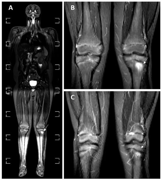 Whole-body MRI in the STIR sequence of an 11-year-old male patient with CNO and a history of joint pain. (A) A whole-body MRI scan. (B,C) Two consecutive cross-sections of the knee joints. The signal elevation in the left tibia in the epiphyseal and metaepiphyseal zones is notable, pointed by white arrows (A–C).