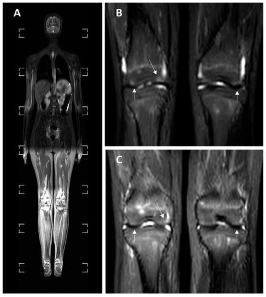 Whole-body MRI in the STIR sequence of a 14-year-old female patient with JIA and a history of knee joint pain. (A) A whole-body MRI scan. (B,C) Two consecutive cross-sections of the knee joints. A small amount of knee joint effusion and the signal elevation in the right femur epiphysis are notable on the images, pointed by white arrows (B,C).