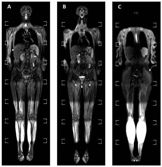 Three consecutive cross-sections (A–C) of the whole-body MRI in the STIR sequence of a 16-year-old male patient with JIIM and a history of muscle weakness. (A) An elevation of signal in the muscles of the right hand and forearm. (B) An elevation of signal in the adductor muscles of both thighs is visible, pointed by white arrows. (C) An elevation of signal in the left gluteus maximus muscle is notable, pointed by arrow.