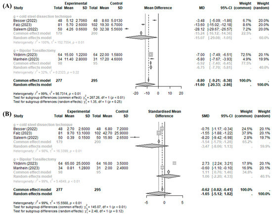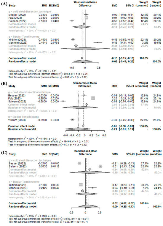 Significant inter-study heterogeneity (I2 > 50%) was found at the above outcomes. In the subgroup analysis of post-tonsillectomy pain compared to cold steel dissection, the pain score was not improved with the BiZact™ device in any time period of postoperative follow-up (day 1 (SMD −0.1426, 95%CI [−0.4914; 0.2063]), day 3 (SMD −0.1526, 95%CI [−0.6926; 0.3873]), and later than day 7 (SMD 0.1517, 95%CI [−0.5574; 0.8608])). However, compared to bipolar tonsillectomy, the BiZact™ device significantly reduced postoperative pain on day 3 (SMD −0.3900, 95%CI [−0.4488; −0.3312]); there were no significant differences in postoperative pain on day 1 (SMD −0.0009, 95%CI [−0.9064; 0.9046]) or later than day 7 (SMD 0.0307, 95%CI [−0.3732; 0.4345]).