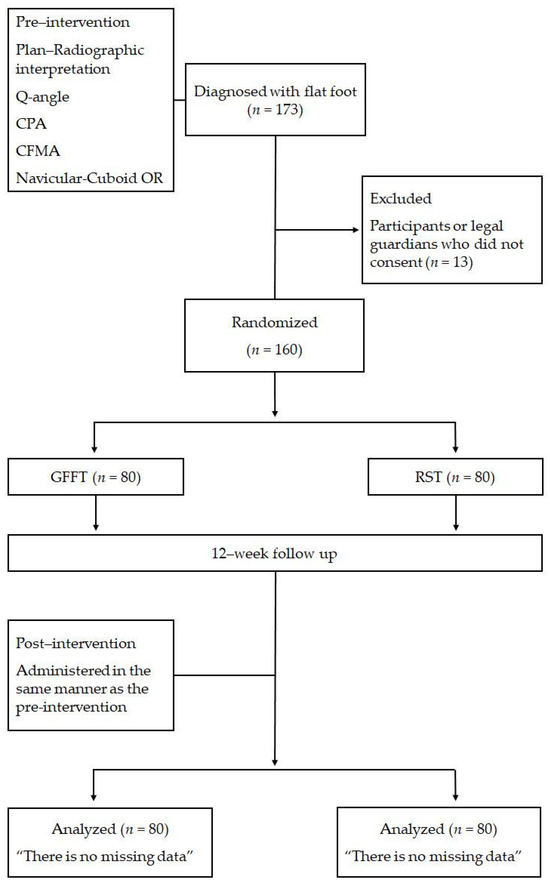 This study was approved by the Research Ethics Committee at Gim Cheon University (approval number: GU-202303-HRa-08-P, approval date: 18 July 2023). Participants were recruited at Nowon Samsung Orthopedics in Seoul, Republic of Korea, where a pediatric orthopedic surgeon selected 173 patients diagnosed with flat feet, aged 6 to 13 years, as potential participants. In this study, participants were selected from patients who visited the hospital during the research period. To ensure uniformity in the training program, only one trainer was assigned to guide all participants throughout the study. Of these, 13 individuals were excluded because they or their guardians did not provide written informed consent, resulting in a final sample of 160 participants. None of the final 160 participants met any further exclusion criteria, and all satisfied the study’s inclusion criteria. Participants were randomly allocated to either the general flat feet training (GFFT) (n = 80) or RST (n = 80) group. We opted for the F test within Analysis of Variance (repeated measures) as our analytical approach. The study sample size was calculated using G*Power (ver. 3.1.9.7, Germany), with a significance level (α) of 0.05, a power (1 − β) of 0.85, and an effect size (f) of 0.24. During the study, a dropout rate of approximately 7.5% was observed [(13/173) × 100], resulting in the final sample size of 160 participants. Prior to the experiment, all participants and their guardians were fully informed about the purpose, content, and procedures of the study, and written consent was obtained. The physical characteristics of the study participants are presented in Table 1.