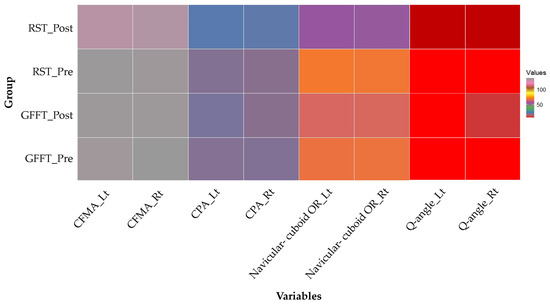 Heatmap visually comparing the values of each variable using colors. Darker hues represent greater values. Q-angle: a significant increase in angle after training is clearly visible in the RST group. CPA: angles increase dramatically following RST, but do not change considerably after GFFT. CFMA: a slight decrease is observed in the RST group, with little changes in the GFFT group. Navicular–cuboid OR: while the ratio declined greatly in the RST group, it also reduced in the GFFT group, albeit less dramatically.