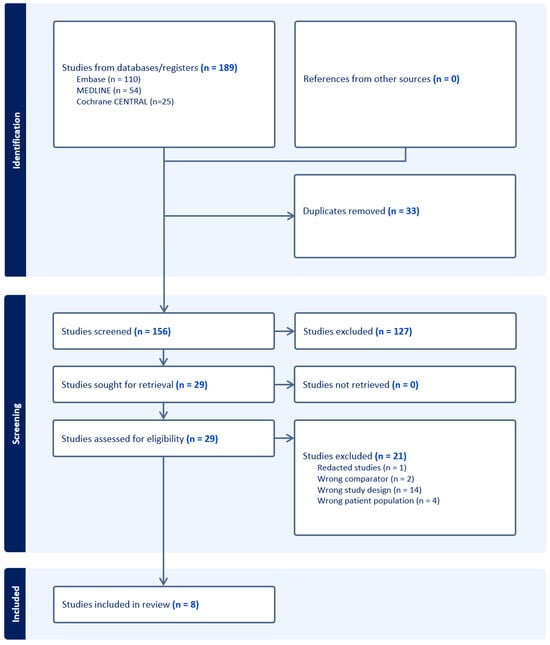A total of 189 articles were retrieved following a computer-assisted search. Following the removal of duplicates, 156 articles underwent title and abstract screening by two independent investigators (KL and JNM) to assess for eligibility, resulting in the exclusion of 127 articles. A full-text analysis was subsequently performed on the remaining 29 articles based on our eligibility criteria. A total of 21 articles were excluded in this process, which included 14 publications with the wrong study designs, 2 studies testing comparators not of interest, 4 studies exploring the wrong patient population and 1 retracted study. The PRISMA flow chart is shown in Figure 1.