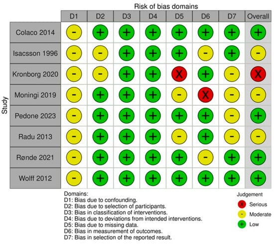 Quality assessment of included articles utilising the ROBINS-I assessment tool [,,,,,,,].