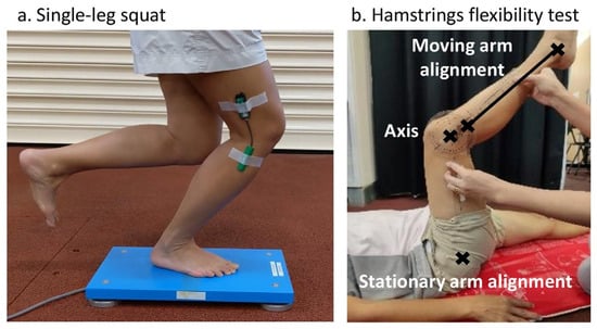 Assessment of (a) single-leg squat using a force plate and an electrogoniometer, (b) hamstrings flexibility using a goniometer.