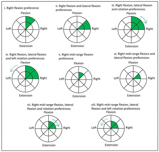 Examples of right flexion directional preference (in green) assessed with the DMA Clinical Pilates method that could find unidirectional (i,v), duo-directional (ii,vi), and multi-directional (iii,iv,vii,viii) preferences.