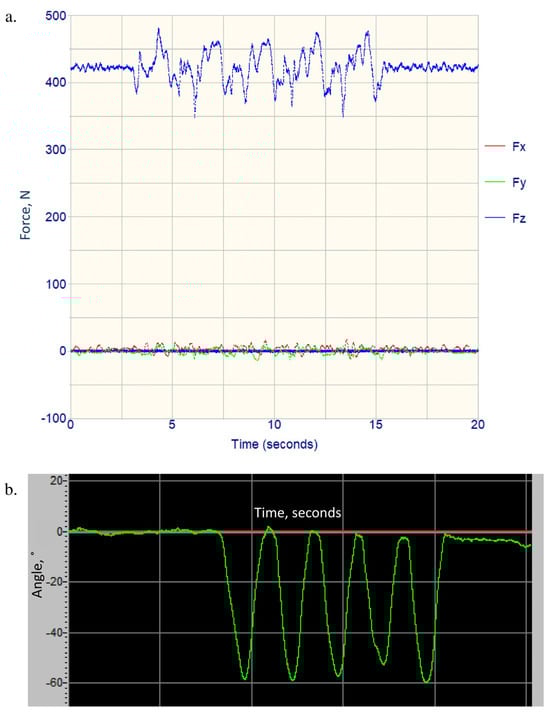 Examples of raw data acquired during the SLS test: (a) force plate data collected via the Bioware software, in Newtons (N), and (b) knee angle (green line) data collected using the electrogoniometer via the Biometrics software, in degrees.