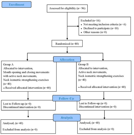 APA StyleAkhter, S., Zafar, H., Ahmad, A., & Farooqui, W. A. (2024). Effects of Integrating Jaw Opening and Closing Movements with Active Neck Exercises in the Management of Chronic Non-Specific Neck Pain: A Randomized Controlled Trial. Medicina, 60(9), 1437. https://doi.org/10.3390/medicina60091437